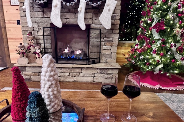 Festive Christmas cabin retreat in Hochatown — cozy fire and full holiday décor included